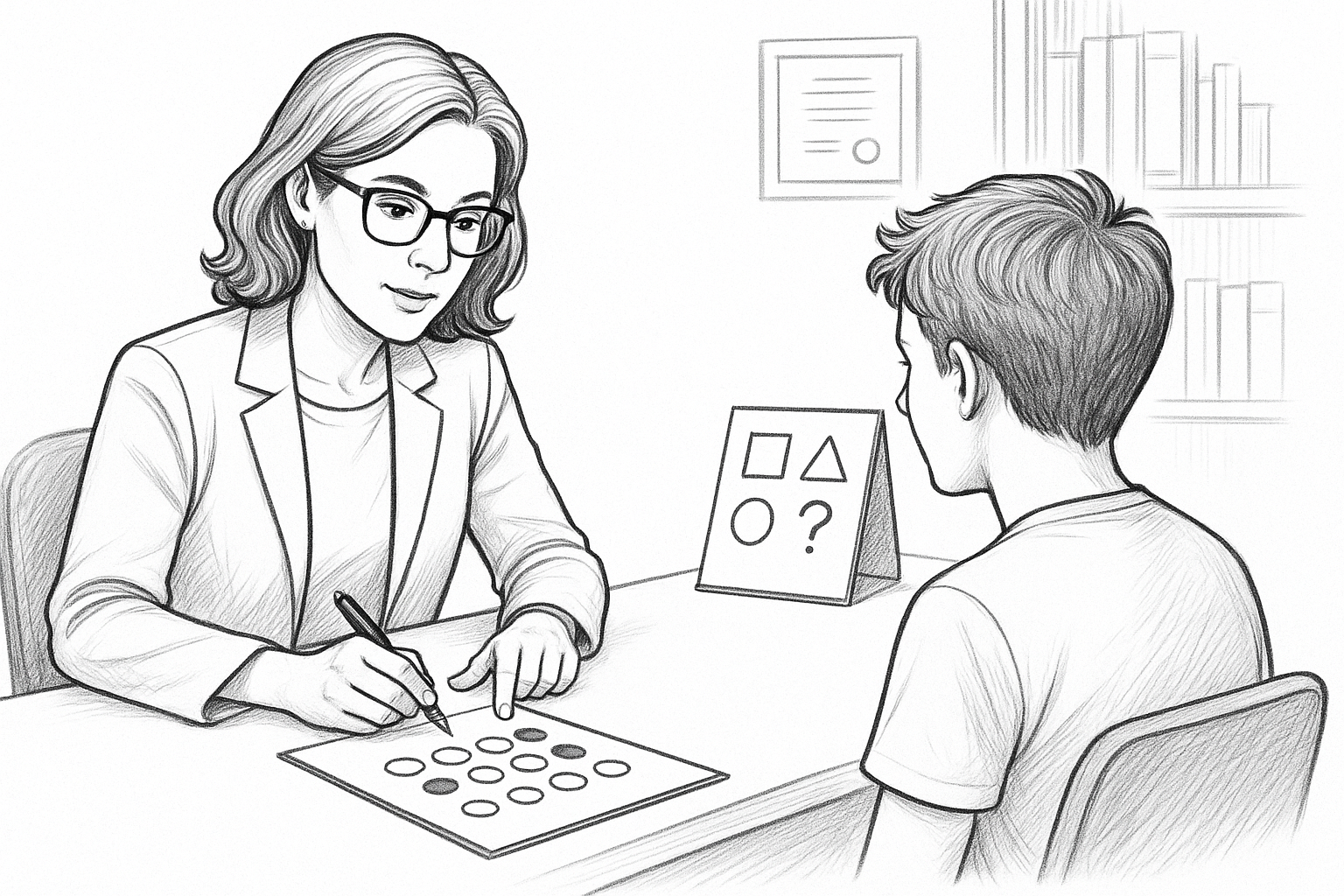 È importante notare che in alcune branche della psicologia clinica, la misurazione non è considerata necessaria o fondamentale. Si pensi ad esempio ad approcci come la psicoanalisi, o alcuni approcci costruttivisti alla psicoterapia. Entrambi non fanno quasi uso di strumenti misurazione e i test hanno un ruolo nullo o marginale. Quando si parla però di neuropsicologia clinica o di di valutazione neuropsicologica, la prima cosa che viene in mente è invece una persona che sta effettuando una serie di test per riuscire a comprendere lo stato cognitivo di un individuo e una serie di punteggi ottenuti da questi test: la misurazione sembra un aspetto imprescindibile. Provando a chiedere a ChatGPT4.0 la seguente cosa Crea un disegno in bianco e nero di una neuropsicologa che sta effettuando una valutazione neuropsicologica il risultato che ho ottenuto (14/09/2025) è la figura qui di seguito: una persona che sta somministrando un test, verosimilmente per misurare qualche aspetto del funzionamento cognitivo della persona esaminata.